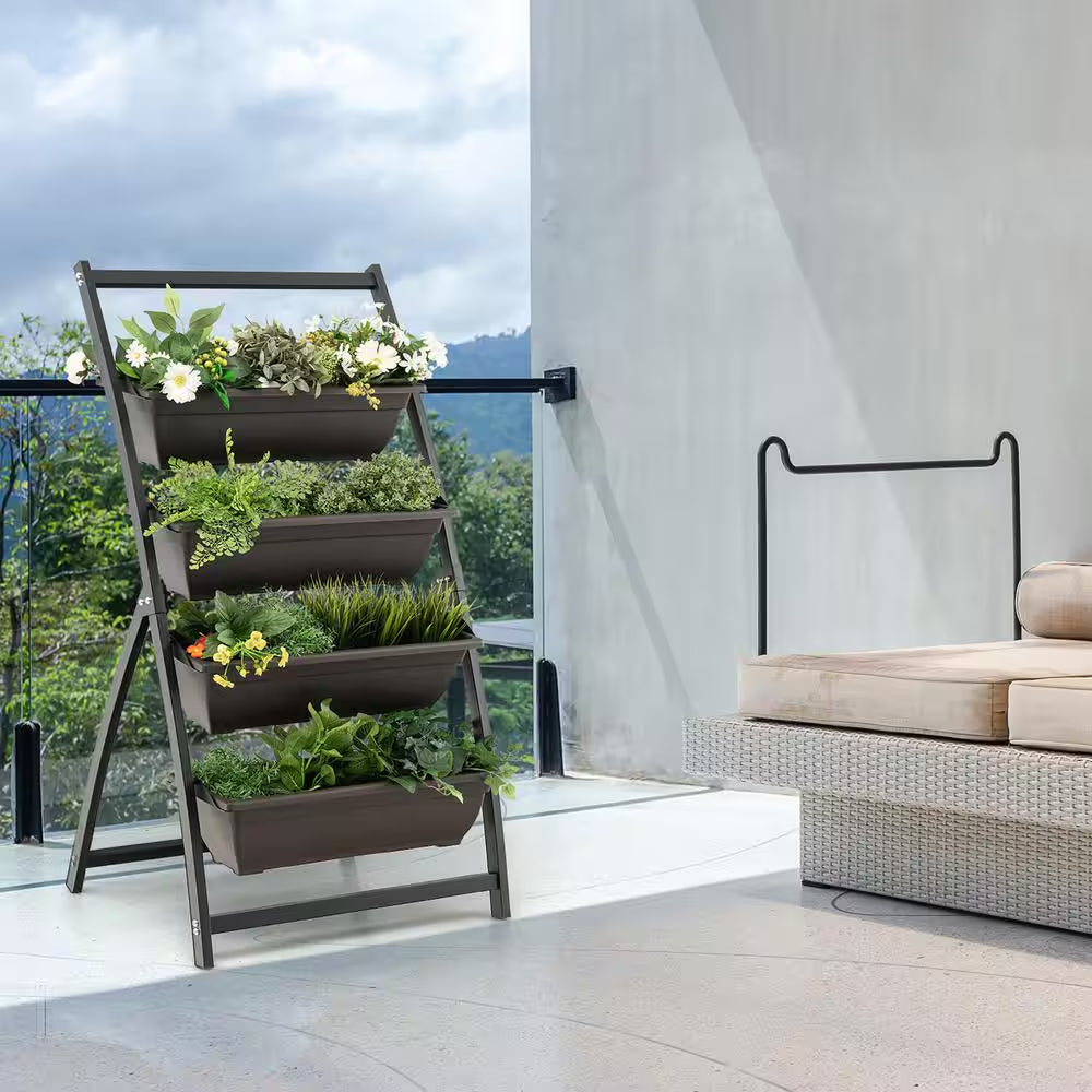 Create a clean and tidy garden with our 4-tier vertical planter box. Whether you want to add a touch of green to your yard or grow your own healthy plants. Our vertical raised garden bed is ideal for you. Its 4-level design makes the plants independent of each other, so you can grow a variety of different plants. In addition, all 4 planter boxes are easy to remove, allowing you to replant your plants. What's more, the garden bed has a good drainage system and both the stepped design and drainage holes will facilitate the removal of excess water. And the planter has a stable triangular structure at the bottom, which effectively lowers the center and avoids toppling. At the same time, the durable and safe PP material is specially designed to withstand the test of outdoor weather. Besides, the assembly and maintenance of the freestanding elevated garden bed is simple. So whether it's in your backyard, garden or bedroom, our vertical garden bed will stay with you for a long time.