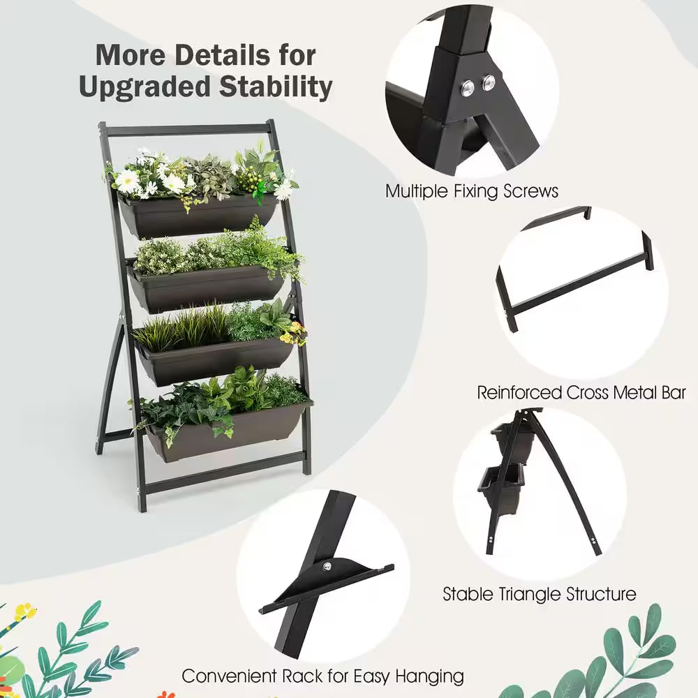 Create a clean and tidy garden with our 4-tier vertical planter box. Whether you want to add a touch of green to your yard or grow your own healthy plants. Our vertical raised garden bed is ideal for you. Its 4-level design makes the plants independent of each other, so you can grow a variety of different plants. In addition, all 4 planter boxes are easy to remove, allowing you to replant your plants. What's more, the garden bed has a good drainage system and both the stepped design and drainage holes will facilitate the removal of excess water. And the planter has a stable triangular structure at the bottom, which effectively lowers the center and avoids toppling. At the same time, the durable and safe PP material is specially designed to withstand the test of outdoor weather. Besides, the assembly and maintenance of the freestanding elevated garden bed is simple. So whether it's in your backyard, garden or bedroom, our vertical garden bed will stay with you for a long time.