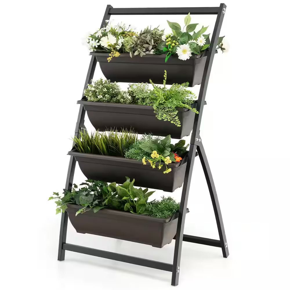 Create a clean and tidy garden with our 4-tier vertical planter box. Whether you want to add a touch of green to your yard or grow your own healthy plants. Our vertical raised garden bed is ideal for you. Its 4-level design makes the plants independent of each other, so you can grow a variety of different plants. In addition, all 4 planter boxes are easy to remove, allowing you to replant your plants. What's more, the garden bed has a good drainage system and both the stepped design and drainage holes will facilitate the removal of excess water. And the planter has a stable triangular structure at the bottom, which effectively lowers the center and avoids toppling. At the same time, the durable and safe PP material is specially designed to withstand the test of outdoor weather. Besides, the assembly and maintenance of the freestanding elevated garden bed is simple. So whether it's in your backyard, garden or bedroom, our vertical garden bed will stay with you for a long time.